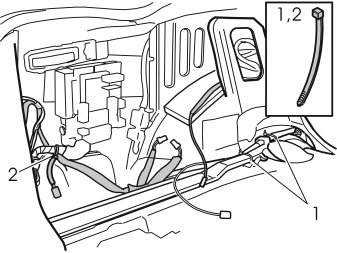 - Route the following cables to the cut out for the radio, between the air duct (1) and the stay (2):