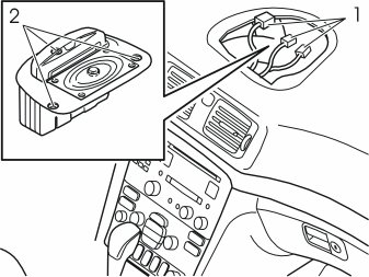 - Carefully remove the loudspeaker grille (1) on the dashboard. Use a weatherstrip tool or similar.