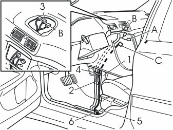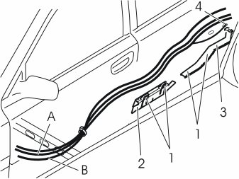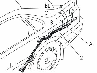 - Route cables A and B (and cable C if the car does not have a CD changer) under the wiring at the cable duct (1). Continue out through the hole in the car body by the front edge of the wheel arch