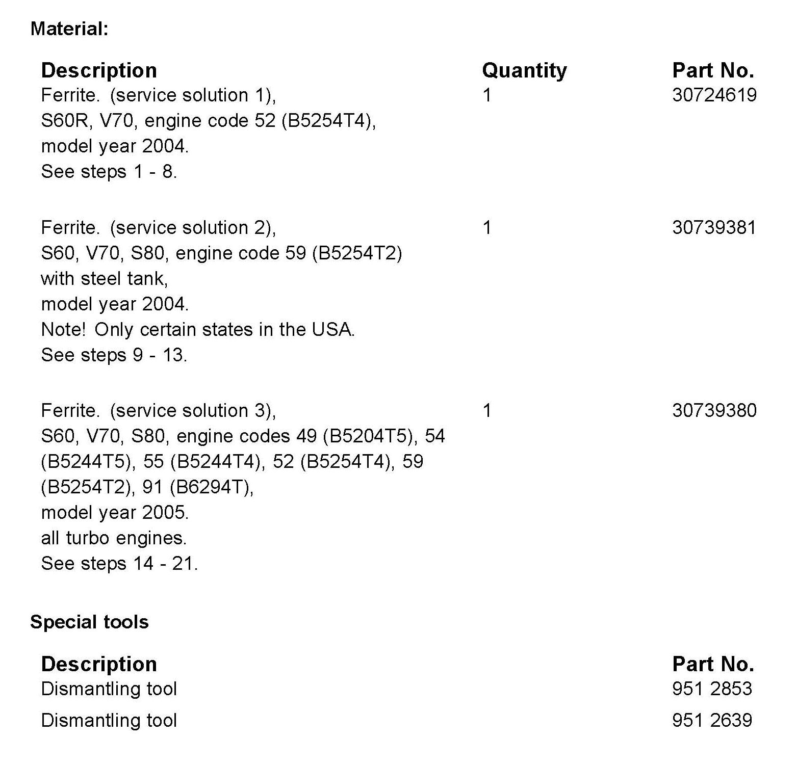 S60, V70, S80, with steel tank sold in a few US states (M/Y 2004), P/N 30739381.