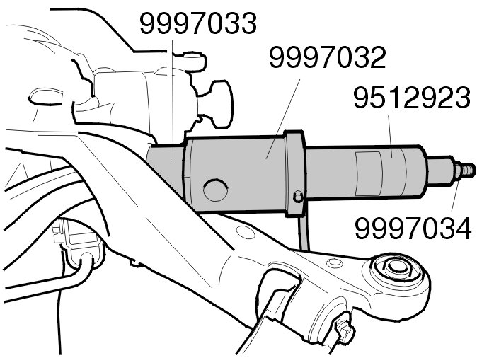 Thread the control arm in. Use tool: 951 2923 Hydraulic hole cylinder 951 2923 Hydraulic Hole Cylinder with 999 7054 Adapter incl. 2x MC6C M6X12 999 7054 Adapter Incl. 2x MC6C M6X12 , 999 7035 Sleeve 999 7035 Sleeve , and 999 7040 Drift 999 7040 Drift.
