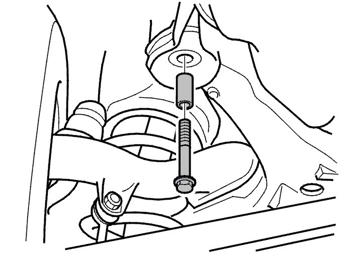Remove the two screws for the inner control arm mountings. Install the hydraulic cylinder and pull out the front bushing using the control arm.