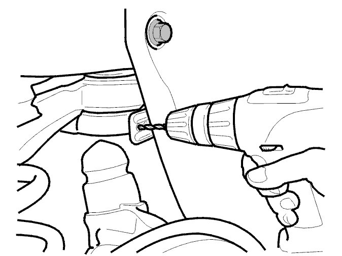 Drill out the heat deflector plate rivet on the sub-frame left rear bushing.