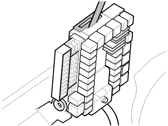 - Release the catch on the top as illustrated. Fold down the integrated relay / fusebox and lift up to release it.