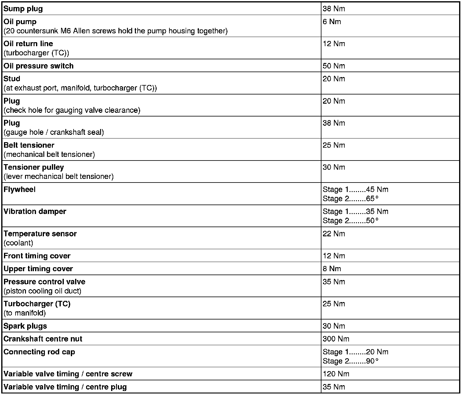 See the table below to find the tightening torques for components not included in the summary.