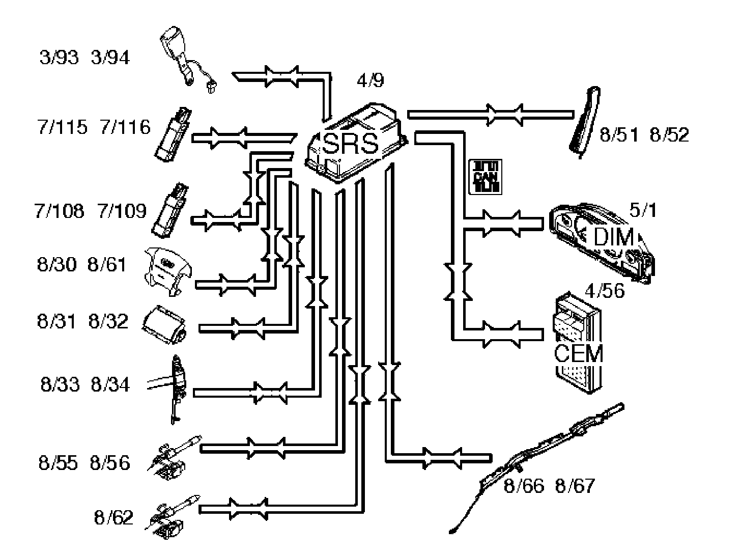When the ignition is turned from position 0 to positions 1, 2 or 3, the status of the internal functions in the supplemental restraint system (SRS) module (4/9) is checked, along with all directly connected components such as: Driver airbags (8/30, 8/61), front passenger airbags (8/31, 8/32), seat belt tensioners (8/33, 8/34, 8/55, 8/56 and 8/62), side impact sensors (7/108, 7/109, 7/115 and 7/116), inflatable curtains (8/66, 8/67) and side impact bags (8/51 and 8/52). From model year 2003, the front seat belt buckles (3/93 and 3/94) are directly connected to the supplemental restraint system (SRS) module. At the same time, the supplemental restraint system module (SRS) transmits data via the Control area network (CAN) to the driver information module (DIM) (5/1) indicating that this test is in progress. The driver information module (DIM) lights the SRS warning lamp. The SRS indicator lamp is lit while the SRS system is being checked. When the SRS system has been tested and if no faults have been detected, the SRS indicator lamp goes out.