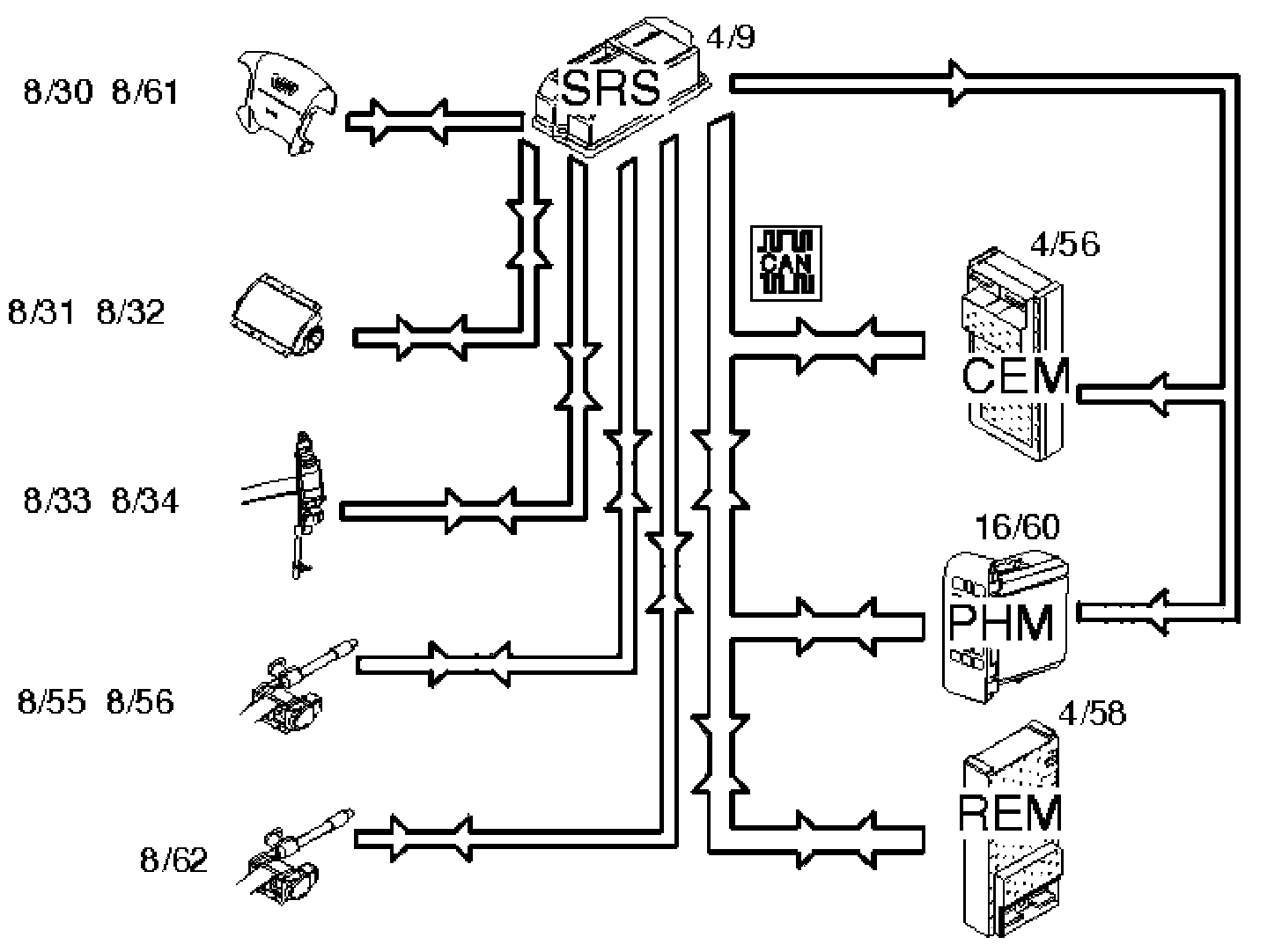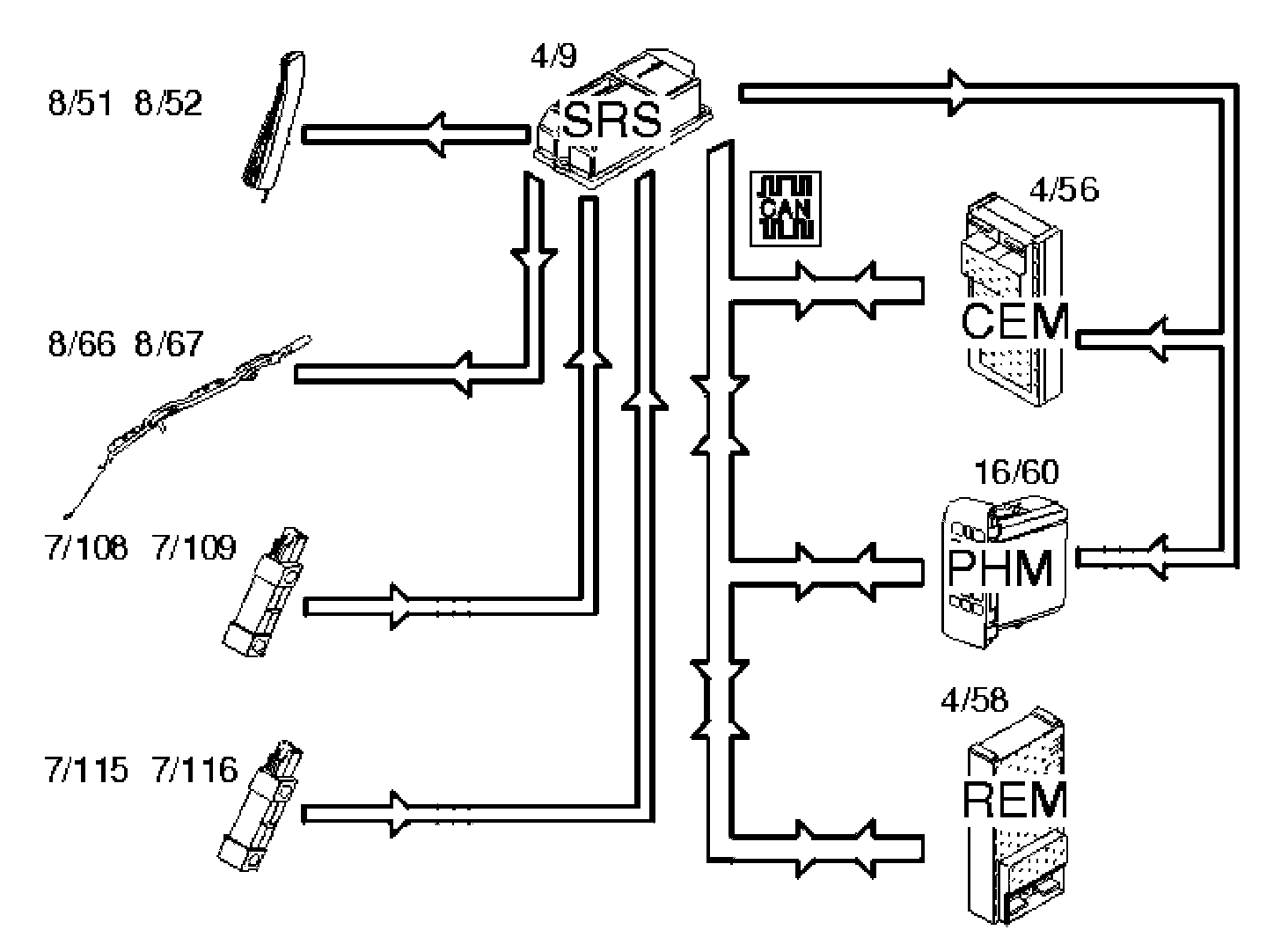 A collision status signal is also sent to the carphone module (PHM) and rear electronic module (REM) (4/58) on the Control Area Network (CAN).