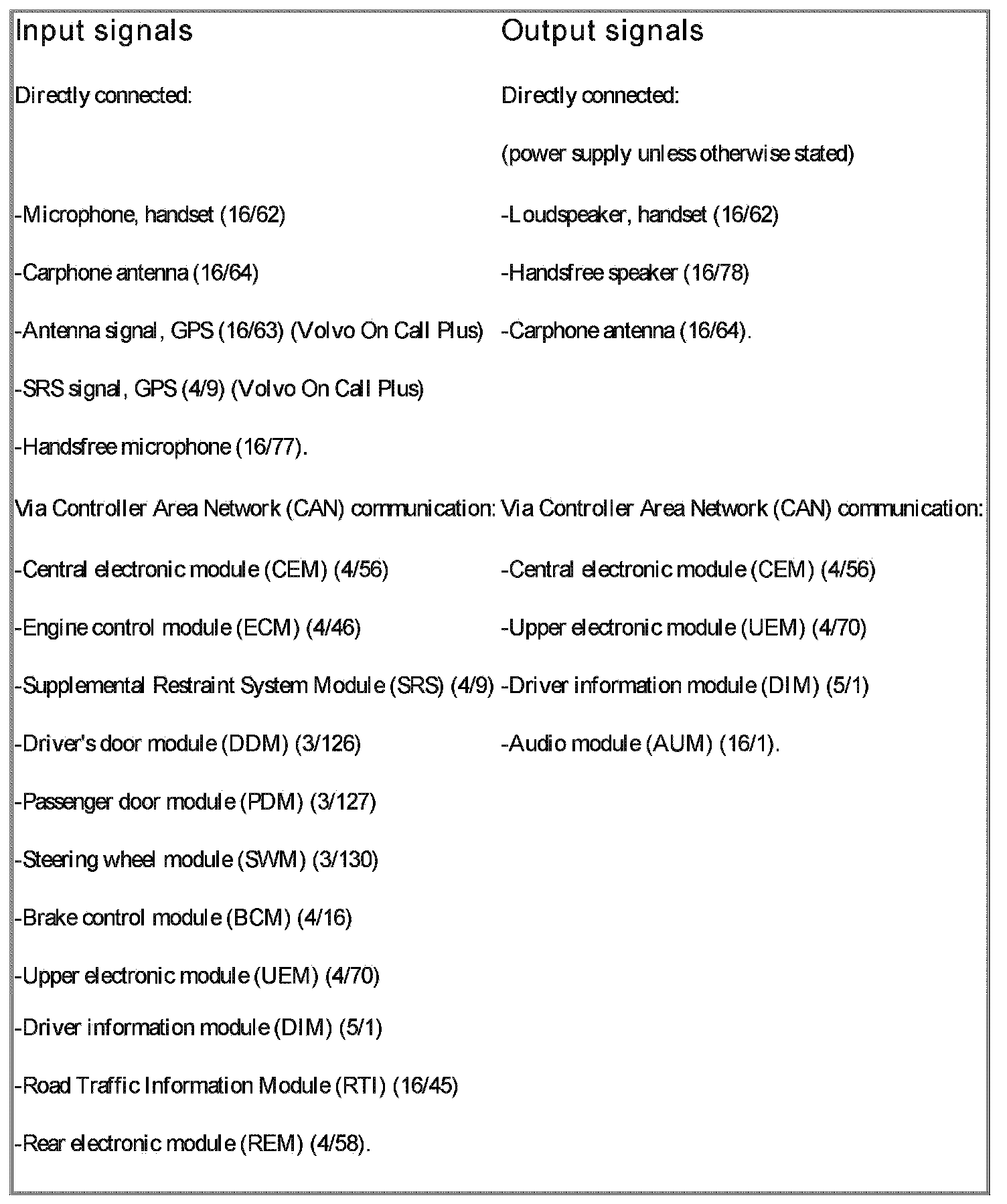 The table summarizes the input signals to and output signals from the phone module (PHM). The signal types are divided into directly connected signals and Controller area network (CAN) communication. The following illustration displays the same information with the Volvo component designations.
