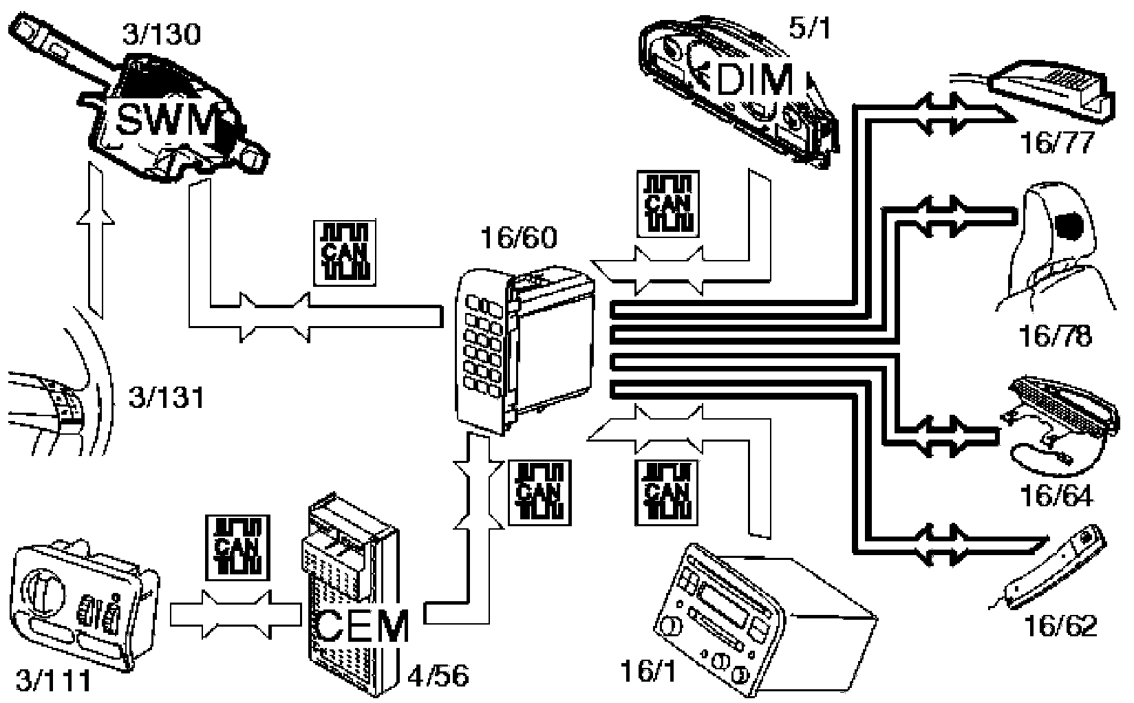 - Position of the ignition key. The phone module (PHM) receives information about the position of the ignition key (in/out, position 1, 2 or 3) from the central electronic module (CEM) via the CAN network