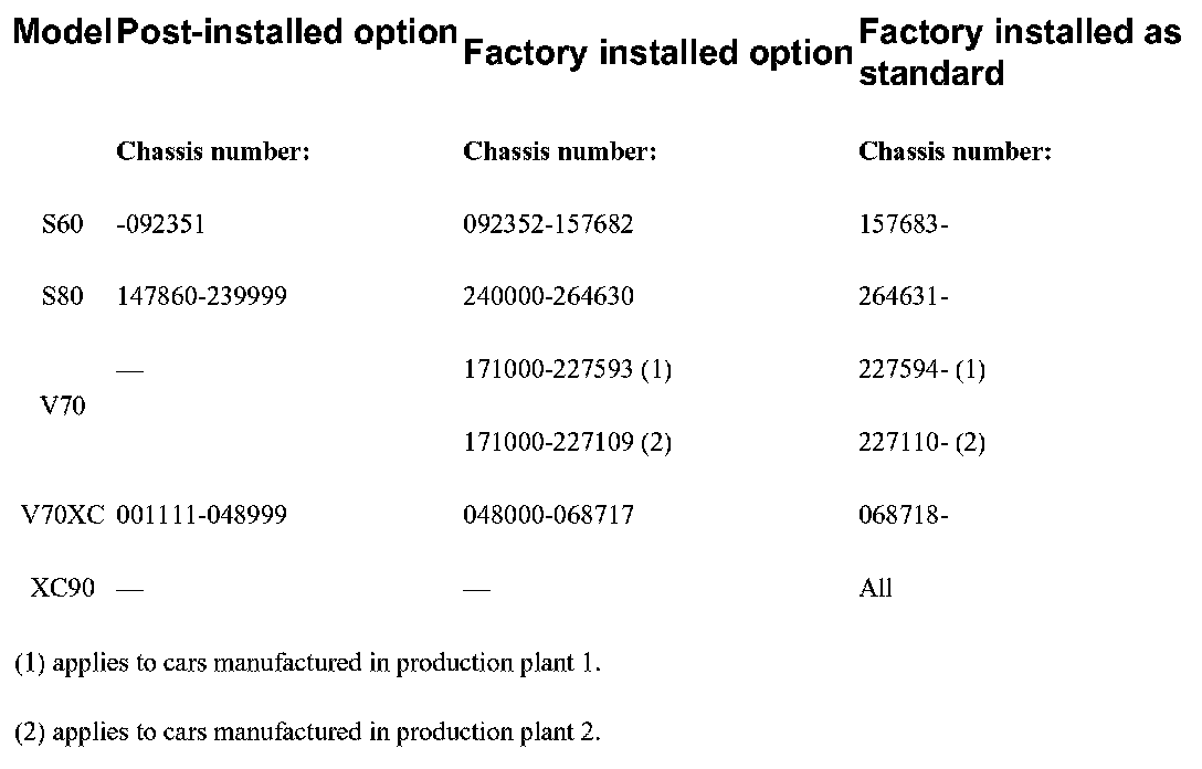 The wiring for the accessory electronic module (AEM) has been post-installed or factory installed as an option on early version cars. The wiring is now factory installed in all cars. See the table below for the chassis numbers.