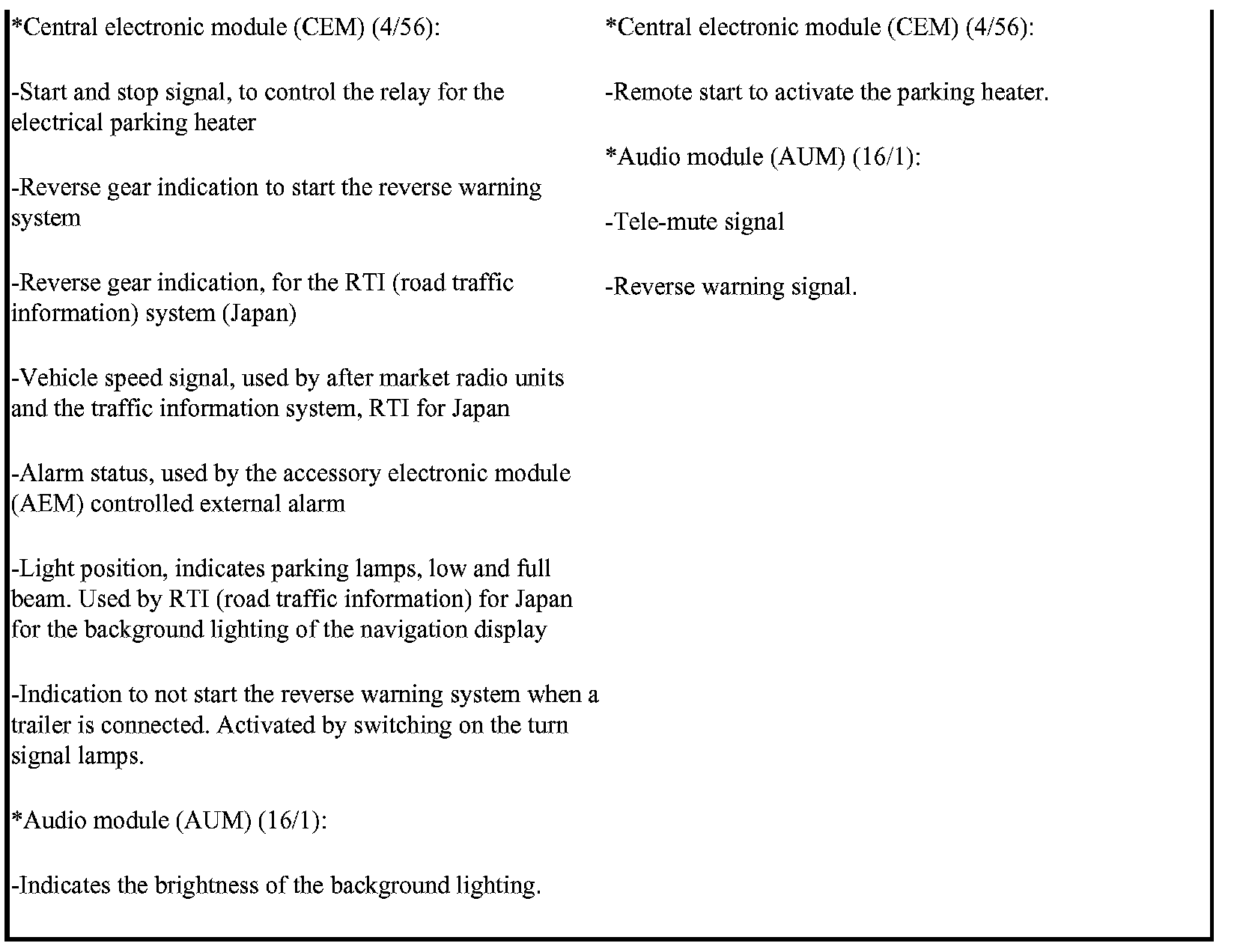 The accessory electronic module (AEM) also receives a mute signal from the reverse warning system and aftermarket hands free unit and transmits it on to the radio unit.