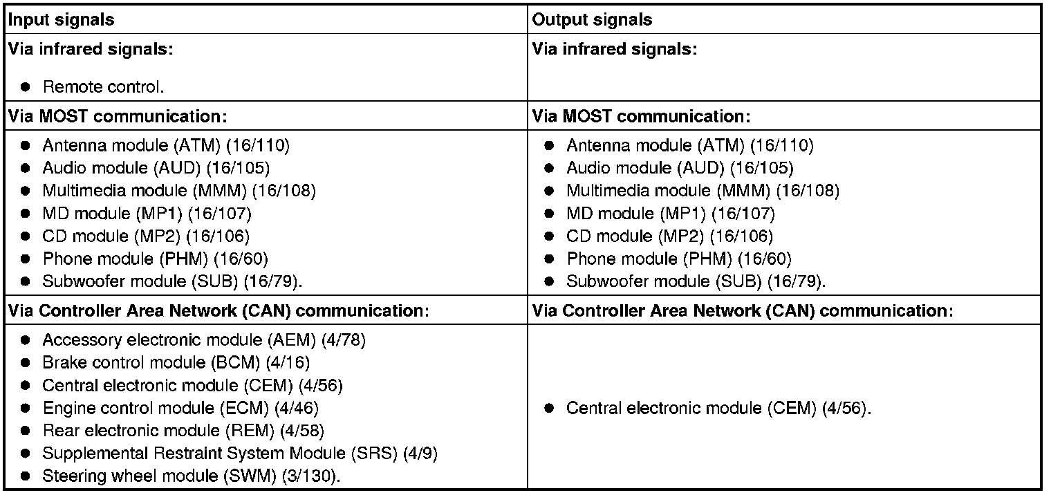 The following table summarizes the input signals to and output signals from the infotainment control module (ICM). The signal types are divided into infrared signals, MOST communication and CAN communication. The illustration below displays the same information with the Volvo component designations.