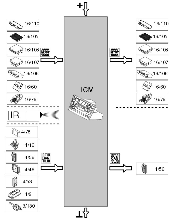 The infotainment control module (ICM) acts as a gateway between the CAN and MOST networks. It also acts as the master control module in the MOST network and checks the other control modules. The infotainment control module (ICM) consists of the following components: