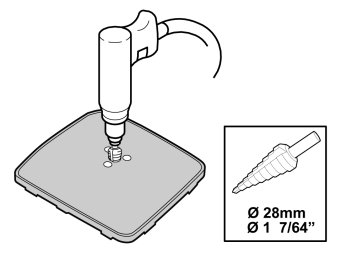 - Take the step drill and drill out the hole for the connection in the holder using a -28 mm (1 7/64") drill bit.