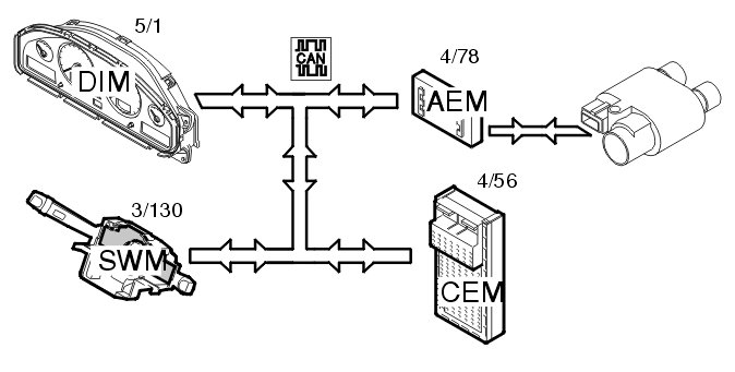 The accessory electronic module (AEM) (4/78) makes it possible to automatically control the telemute function, display lighting and speed-adapted volume control when using an aftermarket radio unit. This is on the condition that the aftermarket radio unit supports these functions. The accessory electronic module (AEM) receives a speed signal (volume adaptation) via the CAN-net and brightness of the display lighting via rheostat from the central electronic module (CEM) (4/56).