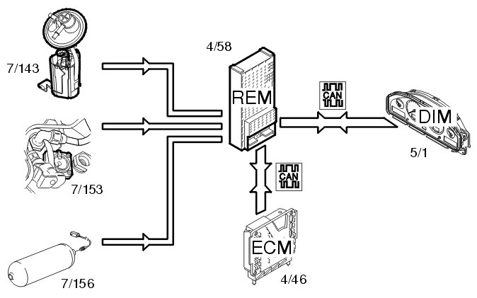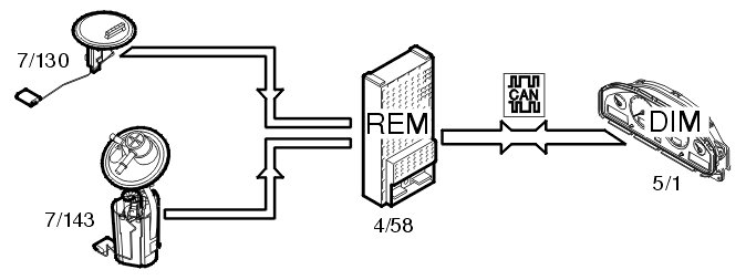 The fuel level is gauged by the fuel level sensors (7/130, 7/143). The signals from the sensors are transmitted to the rear electronic module (REM) (4/58). The rear electronic module (REM) calculates the quantity of fuel remaining by comparing the signals with a tank table stored in the rear electronic module (REM). Information about the quantity of fuel is transmitted via the Control area network (CAN) to the driver information module (DIM) (5/1) where the fuel level is displayed on the fuel gauge.