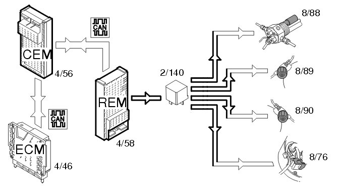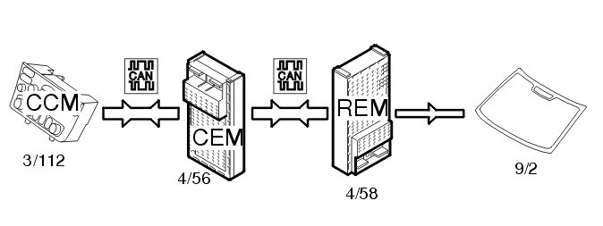 Rear demist (9/2) is activated by pressing the switch on the climate control module (CCM) (3/112). The climate control module (CCM) transmits the data via the Control area network (CAN) to the central electronic module (CEM) (4/56). The central electronic module (CEM) checks that the conditions to start the demist have been met. If the conditions are met, a request is sent via the Control area network (CAN) to the rear electronic module (REM) (4/58) to activate the relay (2/82). The rear electronic module (REM) powers the relay and the demister is powered.