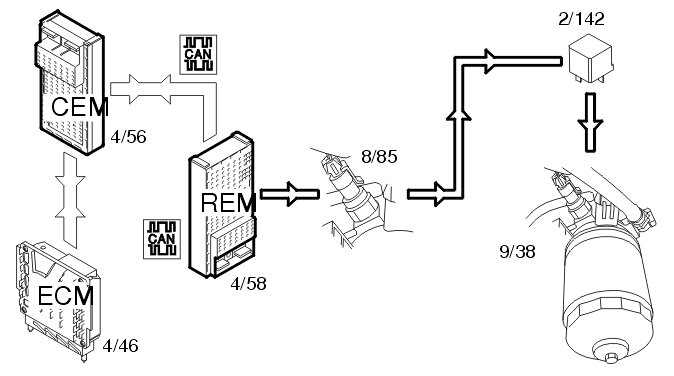 The rear electronic module (REM) receives information via the control area network (CAN) from the engine control module (ECM) (4/46) indicating that the car should run on gas/LPG. The rear electronic module (REM) also receives information via the control area network (CAN) from the central electronic module (CEM) (4/56) indicating the position of the ignition and data about collision status. When the ignition is on and no collision has been registered, the rear electronic module (REM) activates the relay, which supplies the valves with power.