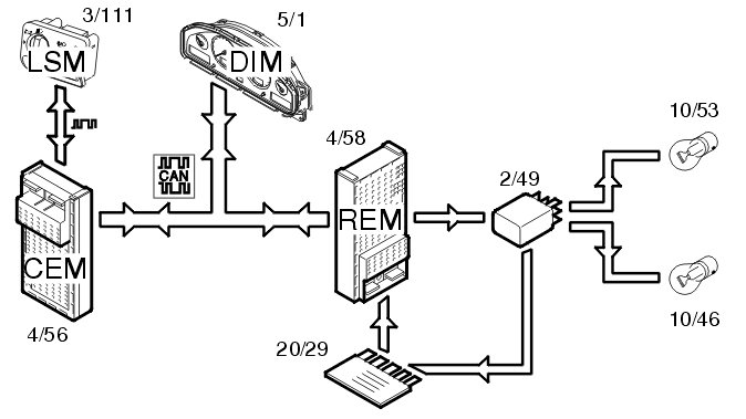 The rear fog lamps (10/46, 10/53) are activated by pressing the button for the rear fog lamps in the lamp switch module (3/111). The light switch module (LSM) transmits a request to light the lamps to the central electronic module (CEM) (4/56) using serial communication. The central electronic module (CEM) transmits the request to the rear electronic module (REM) (4/58) via the Controller area network (CAN). The rear electronic module (REM) activates the relay (2/49) and the lamps are supplied with power via the relay.
