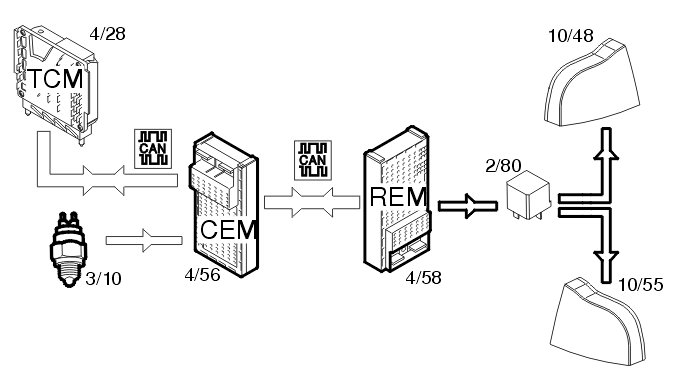 The back-up (reversing) lamps (10/48, 10/55) are activated when back-up (reverse) gear is selected. The switch (3/10) on the transmission is then closed. A directly connected signal is transmitted to the central electronic module (CEM) (4/56) indicating that back-up (reverse) gear is selected. The central electronic module (CEM) transmits the information via the controller area network (CAN) to the rear electronic module (REM) (4/58) to activate the back-up lamps. The rear electronic module (REM) activates the relay (2/80) and the lamps are supplied with power via the relay.