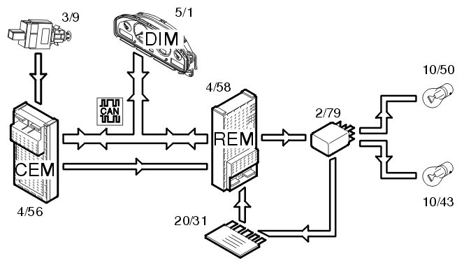 Information about the lamp circuit is obtained by the rear electronic module (REM) via a shunt (20/29). The rear electronic module (REM) sends the status of the lamp fault via the Control area network (CAN) to the central electronic module (CEM). In the event of a fault, the central electronic module (CEM) transmits data via the Control area network (CAN) to the driver information module (DIM) which displays a text message.