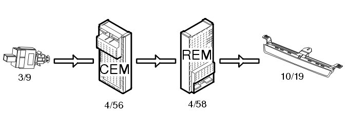 When the stop lamp switch (3/9) is closed, a signal is transmitted to the central electronic module (CEM) (4/56). The signal is transmitted from the central electronic module (CEM) to the rear electronic module (REM) (4/58) via a directly connected cable. The high mounted stop lamp is supplied with power directly from the rear electronic module (REM). The stop lamp is supplied with power for as long as the stop lamp switch is closed.