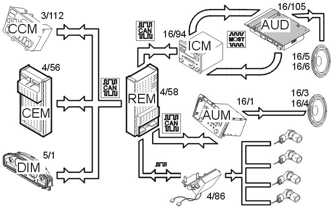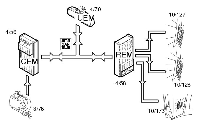 The rear electronic module (REM) also receives information via the Control area network (CAN) from the central electronic module (CEM) (4/56) about: