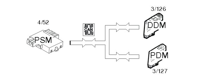 If the car was built in structure week 9950 or later, the car has door mirrors with memories. When the desired memory button is pressed, the mirrors and seat are set to the desired positions. Data is sent from the power seat module (4/52) to the passenger door module (3/126) (3/127) to set the door mirrors to the programmed position. The memory positions of the door mirrors are stored in the driver's door module (DDM) (3/126) and passenger door module (PDM) (3/127). When setting a new mirror position, this is stored in each control module. The position of the driver's door mirror is stored in the driver door module (DDM). The position of the passenger door mirror is stored in the passenger door module (PDM).