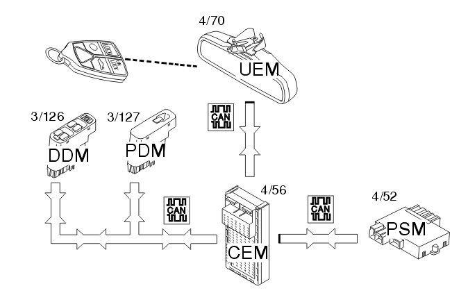 The signal from the remote control is transmitted to the upper control module (UEM) (4/70) when the car is locked or unlocked. The upper electronic module (UEM) also identifies which remote control is being used. The central electronic module (CEM) (4/56) receives this information from the upper electronic module (UEM). The central electronic module (CEM) identifies and stores the remote control which is being used and determines the data to be sent to the power seat module (PSM) (4/52), driver door module (DDM) (3/126) and passenger door module (PDM) (3/127). This is done when the door is opened.