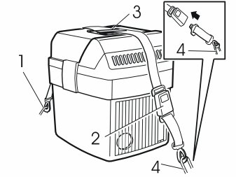 - Install the long strap hook in the front mounting eyelet (1) in the cargo compartment. Allow the strap lock (2) to hang over the front side of the coolbox as illustrated