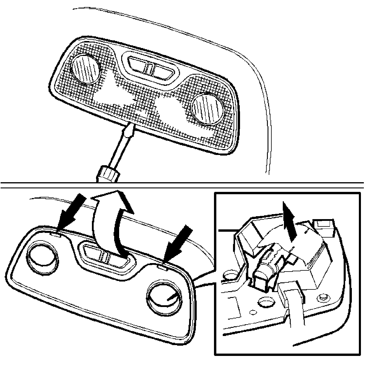 - Release the front edge of the lamp by pressing the catches backward and inward