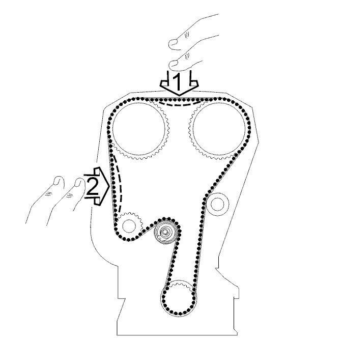 - turn the crankshaft clockwise carefully until the timing belt is tensioned. The belt must be tensioned between the intake camshaft pulley, the idler pulley and the crankshaft