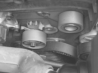 - hold the centre screw on the belt tensioner fixed. Turn the belt tensioner eccentric counter-clockwise until the tensioner indicator passes the marked position.