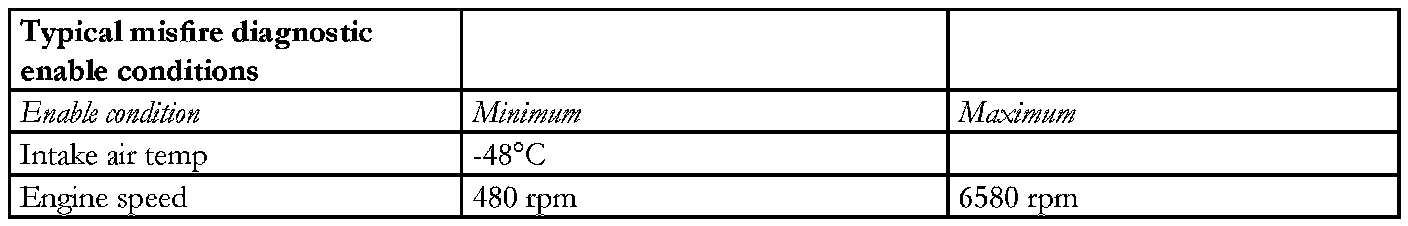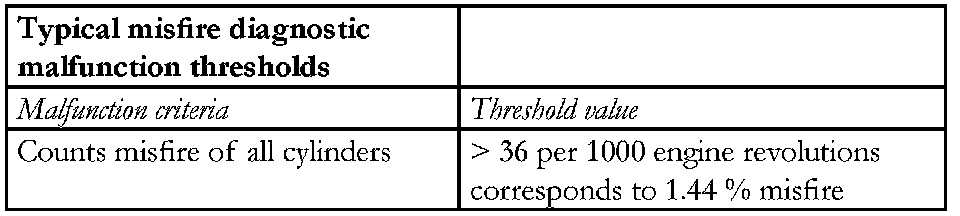 Misfire detection is enabled when the engine speed has reached 150 rpm below warm idle speed plus two crankshaft revolutions or after nine ignitions, depending on which occurs first.For detection of emission related misfires, the number of misfires which have occurred within the first interval of 1000 engine revolutions or the 4th exceedance (for the rest of DCY) over the emission threshold value after the first 1000 engine revolutions are relevant. If the number is so high that the exhaust emission standard is exceeded by a factor of 1.5, then the emission related misfire rate has been reached and exceeded a fault code will be stored. If misfires occur and the threshold is exceeded in the following DCY, MIL illuminates.