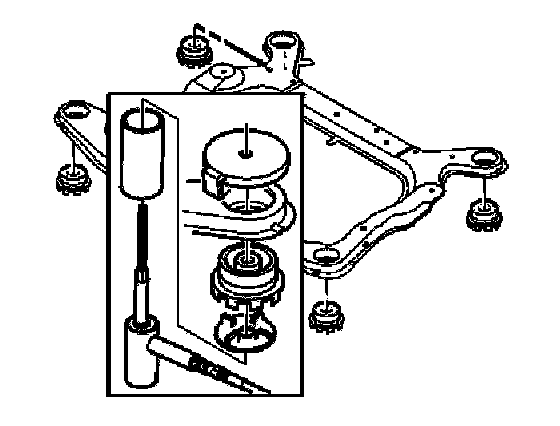 CAUTION: The left-hand rear bushing on the sub-frame is a different version to the other three bushings. The hole in the center of the bushing is oval. The oval must be positioned front-rear with the car.