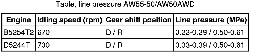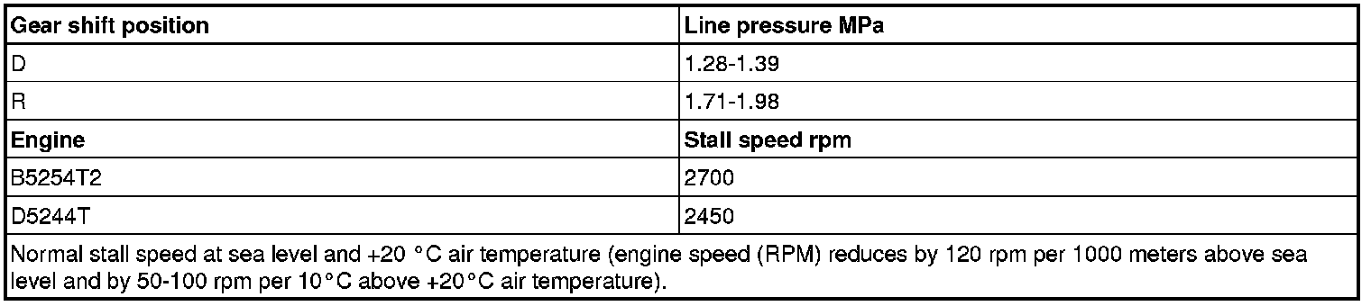 Move the gear selector to position D. Fully depress the accelerator pedal (AP) for a maximum of 5 seconds. Read off the maximum engine speed (RPM) and the line pressure. Compare to the table below.