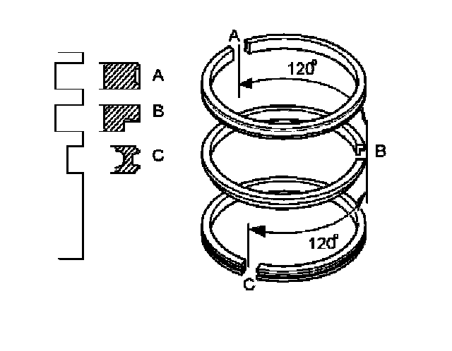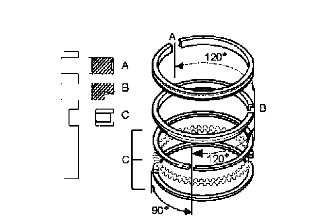 It is important that the uppermost and center rings are installed the correct way up. The lower ring can be installed any way up. Distribute the piston ring openings as follows.