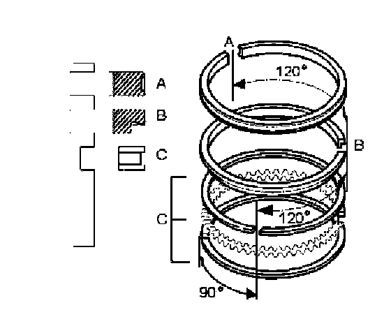 It is important that the uppermost and center rings are installed the correct way up. The lower ring can be installed any way up. Distribute the piston ring openings as follows.