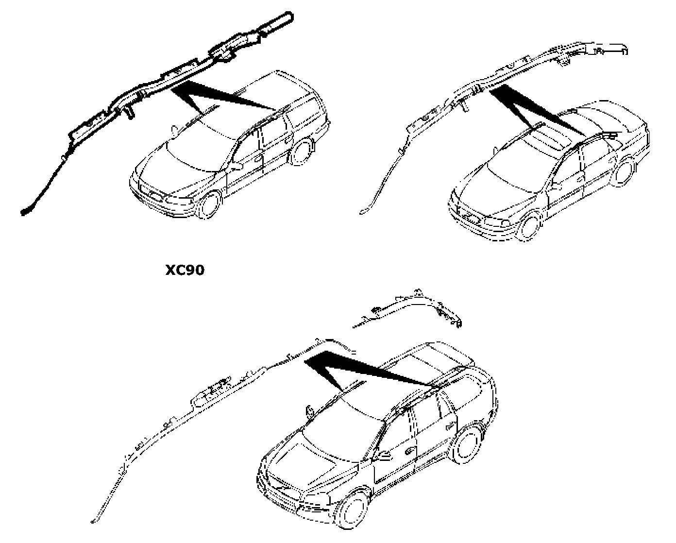 For the 7 seater XC90 models, the inflatable curtains are in the roof between the A and D-posts. For the 5 seater XC90 models and other models, the inflatable curtains are in the roof between the A and C-posts.