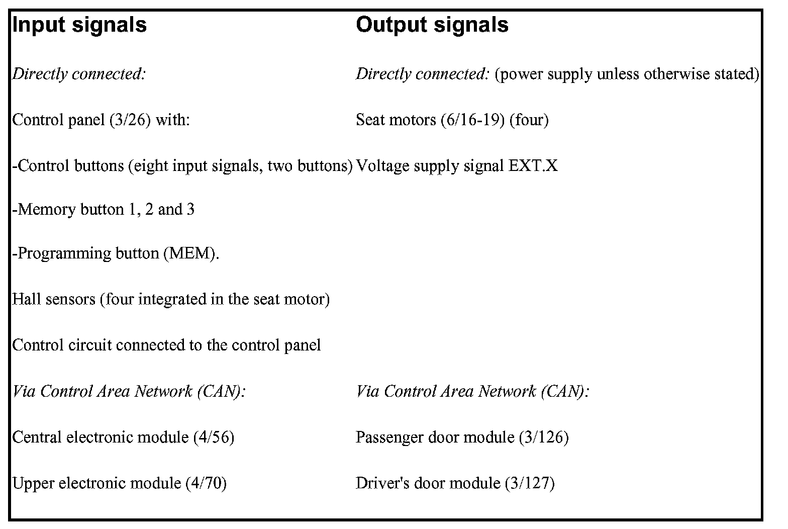 The table below summarizes input and output signals to and from the power seat module (4/52). The signal types are divided into directly connected signals, serial communication and Control area network (CAN) communication. The illustration below displays the same information with the Volvo part numbers.