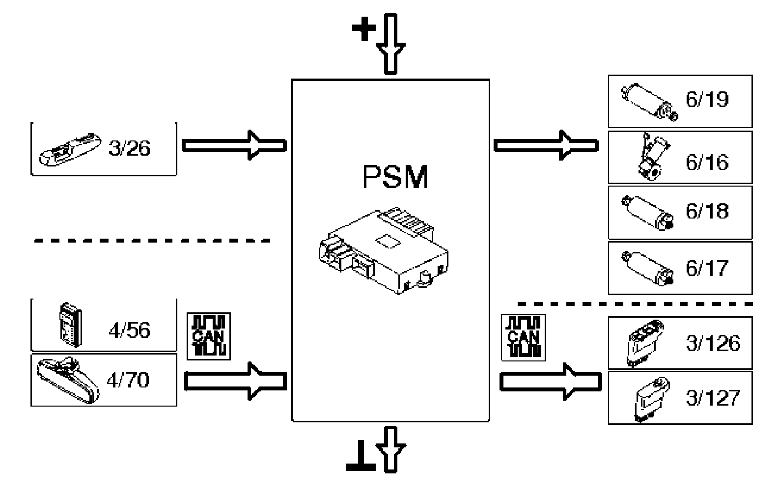 The power seat module is directly connected to components and to other control modules via CAN communication.