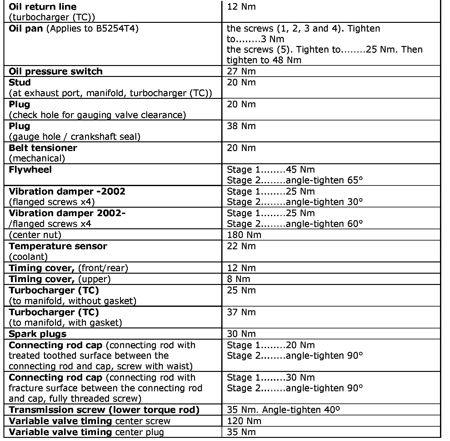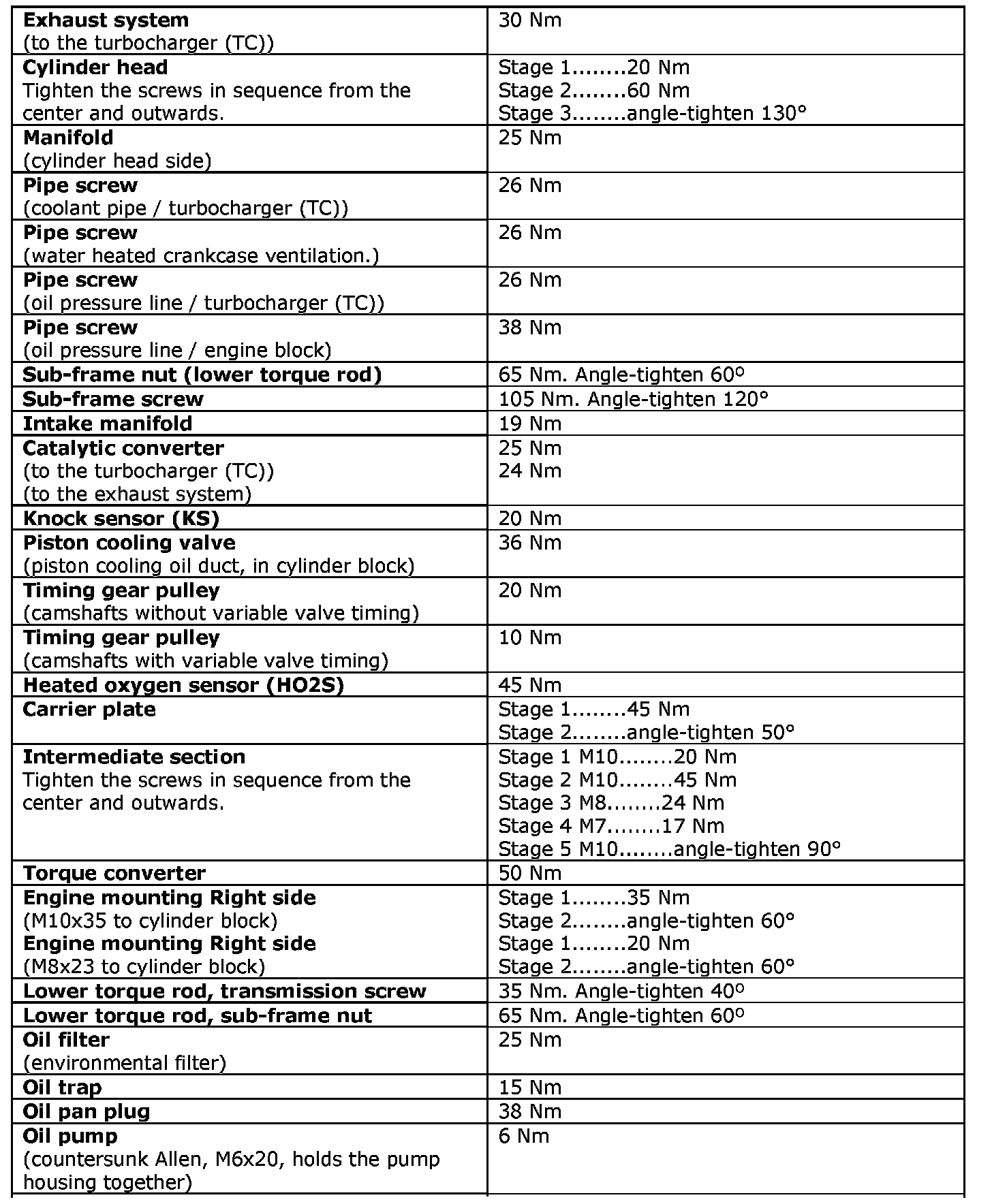 See the table below to find the tightening torques for components not included in the summary.