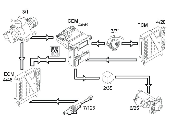 - For transmissions without clutch interlock, the central electronic module (CEM) (4/56) activates relay 2/35 and powers the solenoid in the starter motor (6/25).