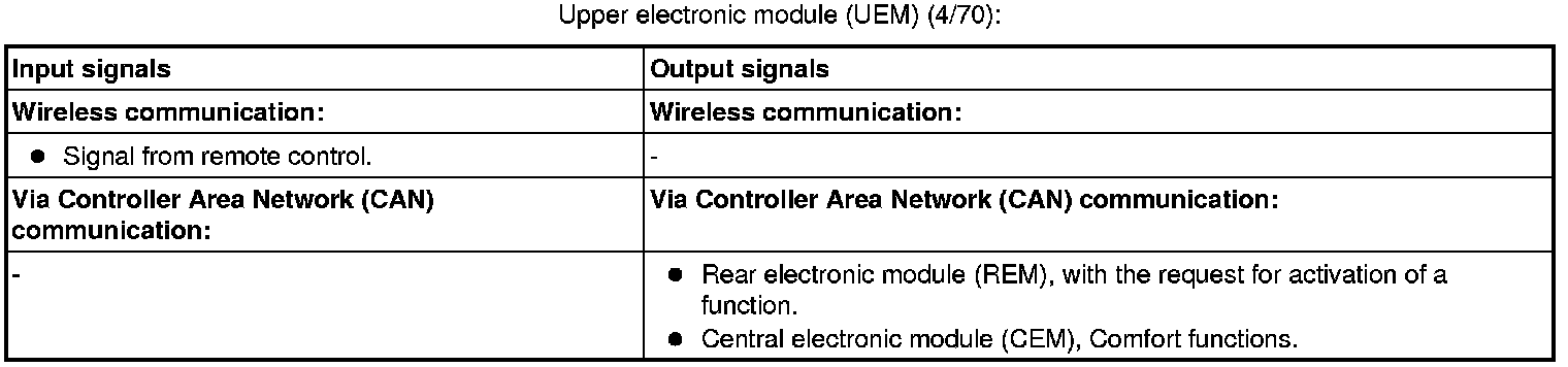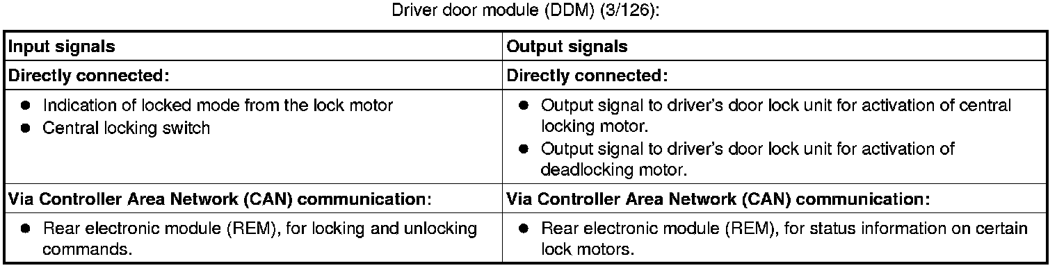 The tables below summarize the input and output signals to the units in the central locking function. The signal types are divided into directly connected signals and Controller Area Network (CAN) communication.