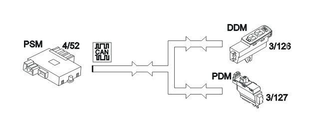 On vehicles with mirrors with memories, the desired positions for the mirrors and seat are set when the relevant memory button is pressed. Information is sent from the power seat module (PSM) (4/52) to the passenger door module (PDM) (3/127) and driver door module (DDM) (3/126) to set the door mirrors to the programmed position. The memory position of the door mirrors are stored in the driver door module (DDM) and the passenger door module (PDM). When setting a new mirror position, this is stored in each control module. The position of the door mirror on the driver's side is stored in the driver door module (DDM). The position of the door mirror on the passenger side is stored in the passenger door module (PDM).