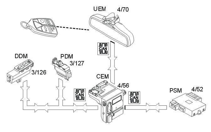 The signal from the remote control is transmitted to the upper control module (UEM) (4/70) when the car is locked or unlocked. The upper electronic module (UEM) also identifies which remote control is being used. The central electronic module (CEM) (4/56) receives this information from the upper electronic module (UEM). The central electronic module (CEM) identifies and stores the remote control which is used. It also determines what information must be sent to the power seat module (PSM), driver door module (DDM) and passenger door module (PDM). This is done when the door is opened.
