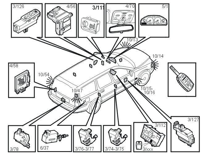 The central locking system is a distributed system. Those parts which are included in the system are: