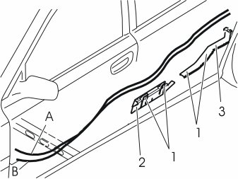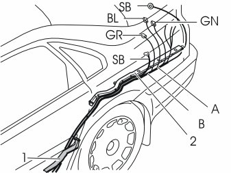 - Route the wiring (A and B) under the wiring at the cable duct (1). Continue out through the hole in the car body by the front edge of the wheel arch.