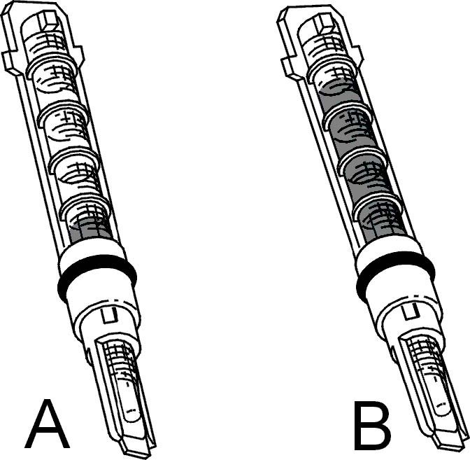 If 4 or 5 filter sections in the expansion valve are clogged (B), the compressor oil must be inspected.