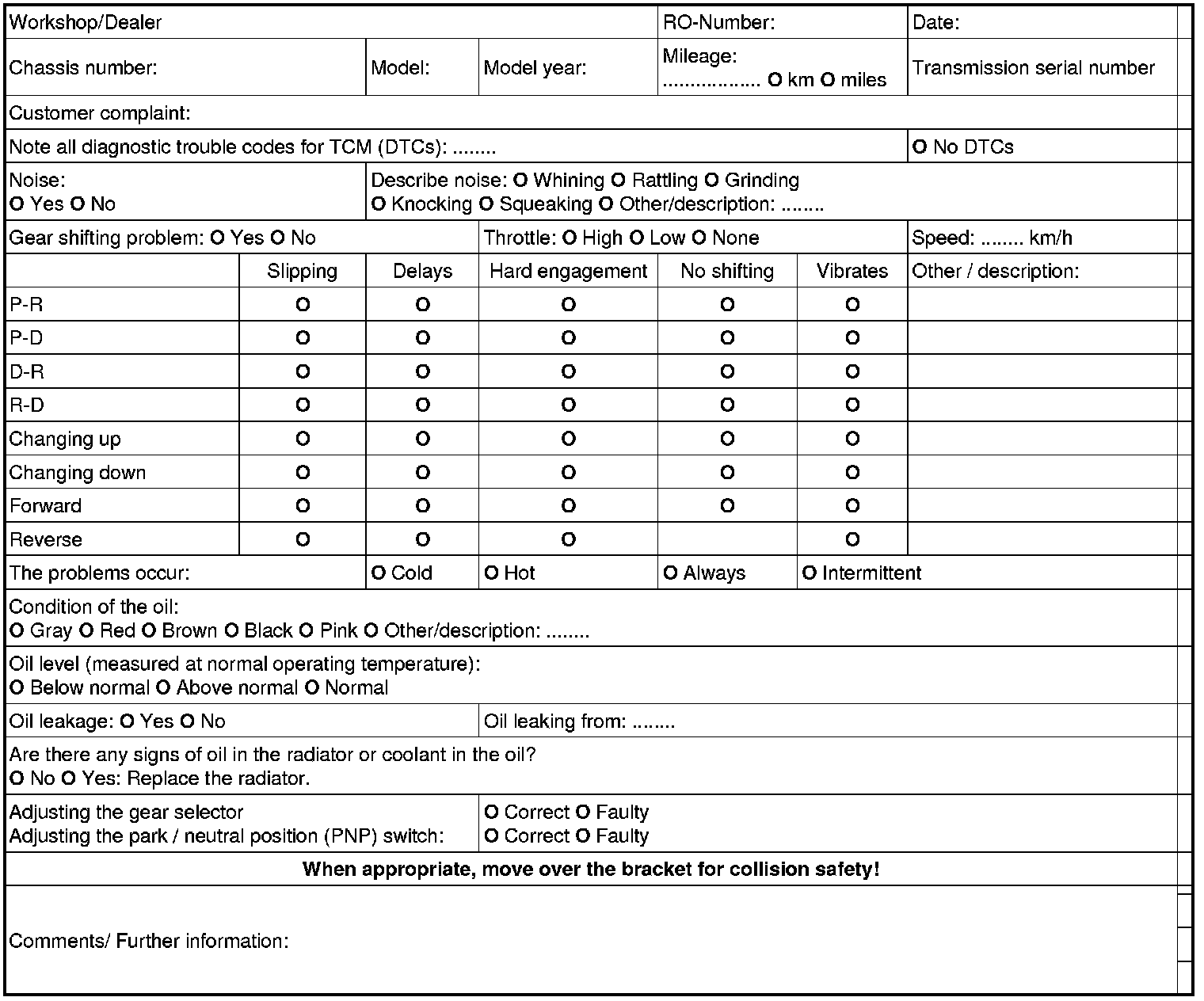 be returned in a plastic pocket attached to the replaced transmission. Also send a copy to the importer and keep the original. All fields must be completed.